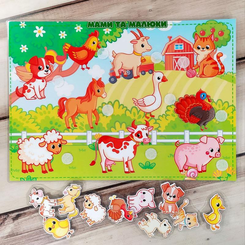 🕯 Возраст: 1+ 🛍️ Комплектация: ламинированный лист с липучками, 10 фигурок на липучках. 📏 Размеры: ▪️аркуша: 30,4*21,6 см (формат А4); ▪️фигурки: - цуценятка🐕: 4,7*4 см; - телятка🐄: 5*4,6 см; - пороська🐖: 4,7*4,1 см; ▪️липучки: 1,5 см в диаметре. 🧰 Материал: картон, ламинация, липучки. 🗣️ Язык: украинский.