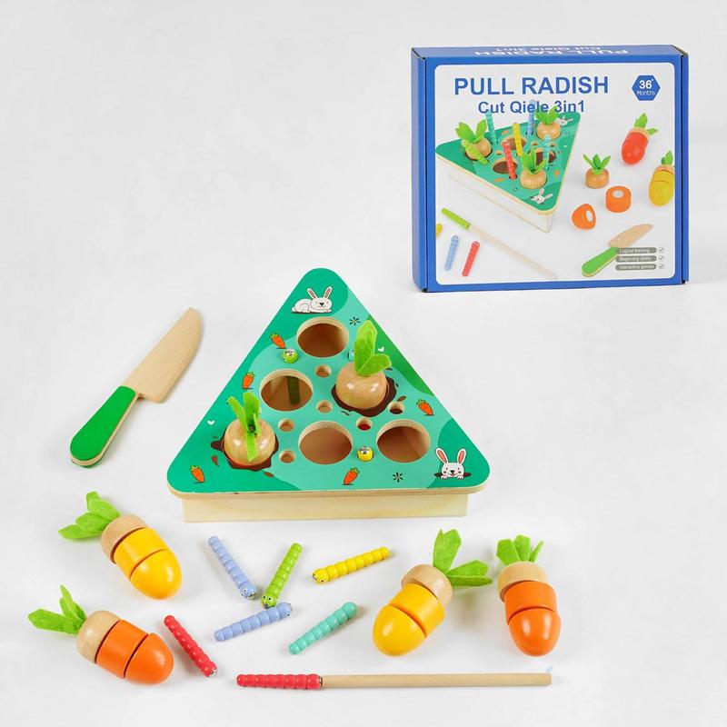 "Витягни редьку" - це весела інтерактивна гра, яка подарує безліч цікавих і цікавих моментів. Гра представлена у вигляді трикутної дерев'яної платформи, куди може вставлятися редька, а поряд мешкають пронизливі гусениці. Гра відмінно сприяє розвитку уяви, логічного та творчого мислення та покращує дрібну моторику малюка. - редька розділена на кілька частин і поєднується липучками; - гусениці мають магніти, до них іде магнітна дерев'яна паличка; - у комплекті до редьки йде дерев'яний ніж; - гра підходить дітям віком від 3 років; - Гра сприяє розвитку логічного мислення. Увага. Виробник залишає за собою право змінювати комплектацію, колірну гаму та характеристики товару без попереднього повідомлення. .