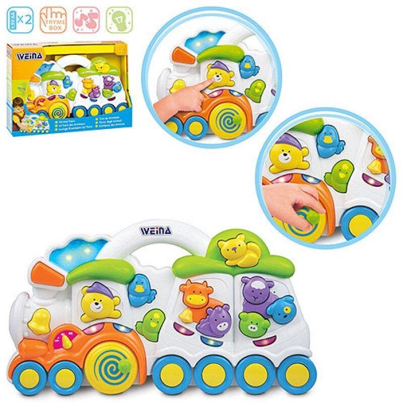 Дитячий музичний поїзд із тваринами. Особливості: поїзд з яскравими колесами, які можуть рухатися рівною поверхнею і видавати звуки поїзда. На панелі знаходяться одинадцять кнопок тварин, що активують різні звуки, ведмедик запускає мелодії, підсвічується різними кольорами, є перемикач, що налаштовує гучність. Розмір: 40 * 7 * 22см Виробник: Китай Матеріал: пластик (не містить шкідливих речовин) Вік: від 12 місяців