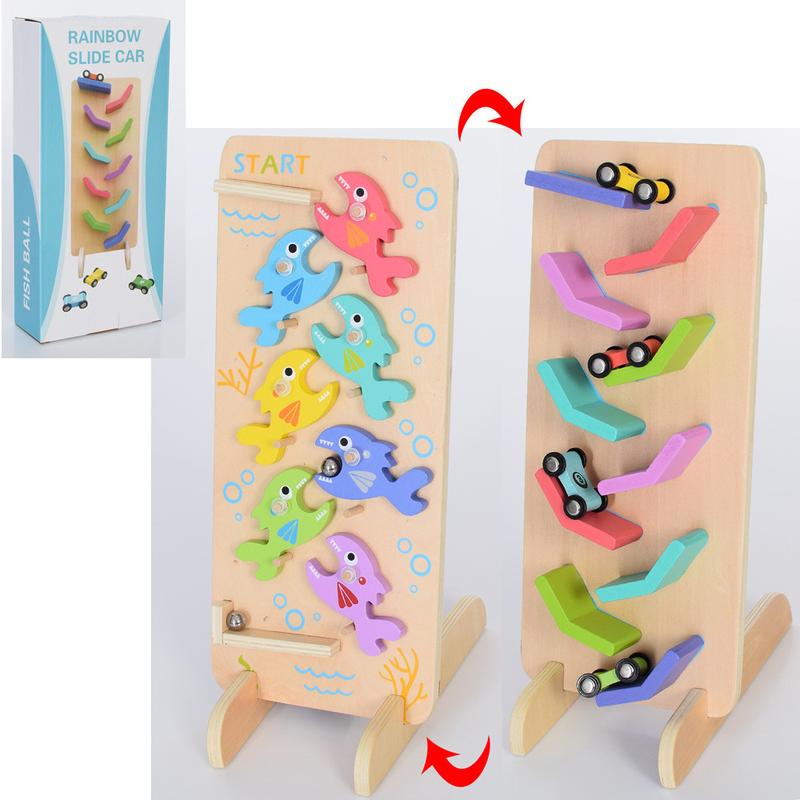 Деревянная игрушка трек машинки 4см 4шт, 2в1 (лабиринт), шарики, md2891