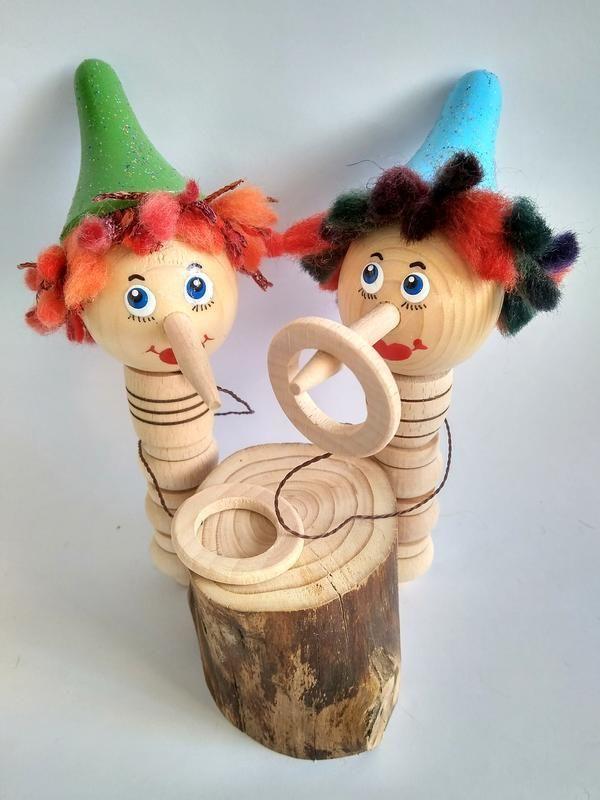 Розвиваюча іграшка, злови кільце, закидушка, бильбоке, пастка, Буратіно, дерев'яна іграшка, еко, ручна робота. Веселий Буратіно допоможе цікаво провести час. Зміст гри: зловити кільце на ніс Буратіно. Можна проводити змагання між дітками на святах і днях народженнях: хто швидше одягне кільце на ніс Буратіно, той і переможець. Азарт в очицях, сміх і гарний настрій будуть всім нагородою. Висота іграшки ~15см. Кожна іграшка виточена і розмальована вручну. В роботі використані тільки водорозчинні лаки і фарби, призначені для дитячих іграшок Додаткові характеристики: Матеріал: Дерево