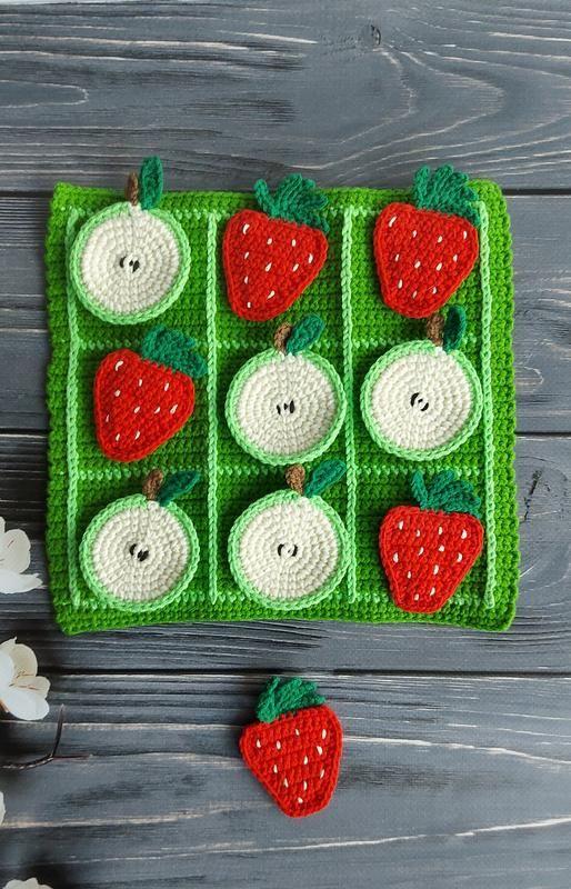 🍏 Добре всім відома гра на логіку в яскравому соковитому виконанні 🤗 🍓 Виконана з напівбавовняної пряжі. Розмір полотна 20х21 см, розмір полунички і яблучка 5 см, +2см хвостик. 🍏 Можливий повтор, або ж обрати інші фігури для гри (комашки, фрукти і овочі, геометричні фігури,...) Додаткові характеристики: Стать: Унісекс Вік: До 6 років Матеріал: Текстиль Вид: Розвиваючі килимки Товар виготовляється на замовлення