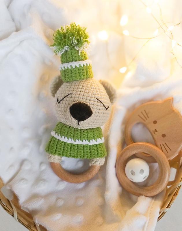Брязькальце ведмедик в шапочці - чудове поєднання екологічності, безпеки та розваги для вашого малюка. Матеріали, які використовуються для виготовлення іграшки повністю безпечні та екологічні. Адже деталі іграшки виконані з напівбавовняної пряжі, а гладко відшліфоване кільце, зроблене з буку. Наповнювач іграшки - гіпоалергенне волокно, під назвою холофайбер. Висота іграшки 13 см Додаткові характеристики: Стать: Унісекс Вік: До 1 року Матеріал: Пряжа Вид: Брязкальця Товар виготовляється на замовлення