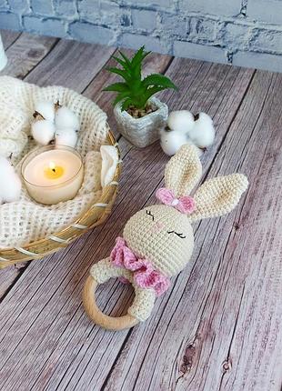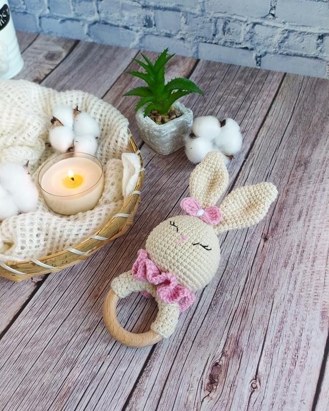 Брязькальце зайчик- чудове поєднання екологічності, безпеки та розваги для вашого малюка. Матеріали, які використовуються для виготовлення іграшки повністю безпечні та екологічні. Адже деталі іграшки виконані з напівбавовняної пряжі, а гладко відшліфоване кільце, зроблене з буку. Наповнювач іграшки - гіпоалергенне волокно, під назвою холофайбер. Висота іграшки 15 см Додаткові характеристики: Стать: Унісекс Вік: До 1 року Матеріал: Пряжа Вид: Брязкальця Товар виготовляється на замовлення