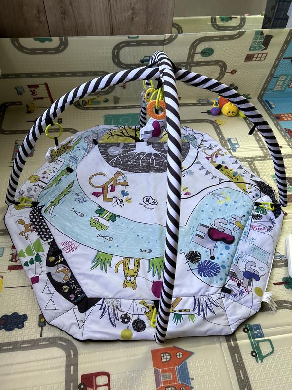 Відсутня 1 чорна кулька Незначні потертості на дзеркальці З часом наліпки, які тримають килимок у формі манежу, вже не такі липучі Великий інтерактивний килимок із функцією манежу Kinderkraft Smartplay забезпечує дитині веселощі та безпеку. Різноманітні іграшки та можливість їхнього переміщення розвивають рухові та ручні навички малюка та стимулюють його почуття. Простота збирання й транспортування. 6 кольорових стінок із різними сюжетами. Ви можете їх добирати та скріплювати одну з одною, що спонукає дитину підіймати голову. Килимок складається в такий спосіб, що він також виконує функцію манежу. У комплекті 7 іграшок із різними естетичними та пізнавальними цінностями, завдяки яким дитина швидше розвивається. Іграшки можна вільно прикріпити до основи килимка та дузі. 20 кульок у 4 кольорах ідуть із килимком — додаткова форма розваги для дітей. Контрастні кольори та чорно-білі деталі стимулюють почуття дитини з перших днів життя. До комплекту входить зручна подушка, що покращує комфорт, лежачи на животі. Дитина також може грати, лежачи на спині або сидячи. Матеріал: якісний поліестер Стандарти: продукт випробуваний і схвалений відповідно до європейського стандарту безпеки EN 71-1.