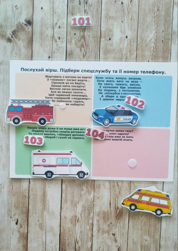 Детали на липучках: 4 вида транспорта, 4 номера службы. Формат А4.