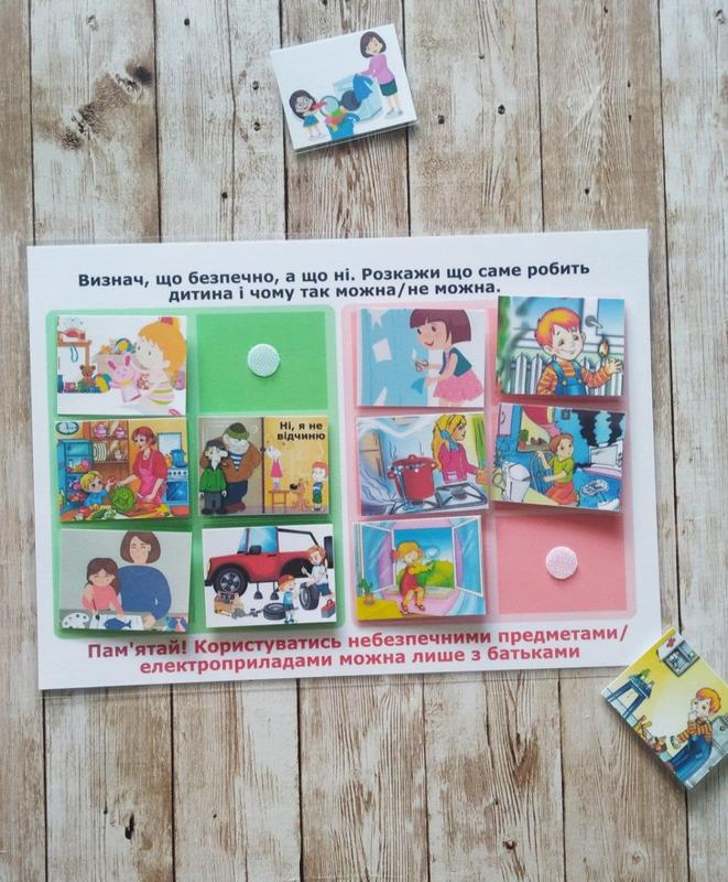 12 ситуативних картинок на липучках. Задача дитини розсортувати та пояснити ситуацію. Формат: А4.