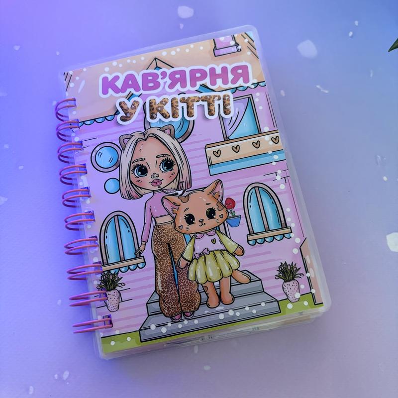 Мини-альбом "Кавярня в Китти" 📏 Удобный формат 10х15 (можно брать с собой в дорогу, на прогулку, играть с друзьями). 👗 Альбом хоть и маленький, но здесь много красивых нарядов: 5 нарядов для куклы и 2 костюма для кошочки. 🍰 В книге есть кафе, где вы найдете милые кофейные десерты и чашечку чая. 🎭 Все необходимое для классной сюжетно-ролевой игры мы оставили в мини-версии. 🎁 Это отличный вариант для приятного подарка ребенку как на именины, так и без повода. 🧩 8 страниц, 6 игровых полей, 27 деталей. 💰 Цена: 250 грн.