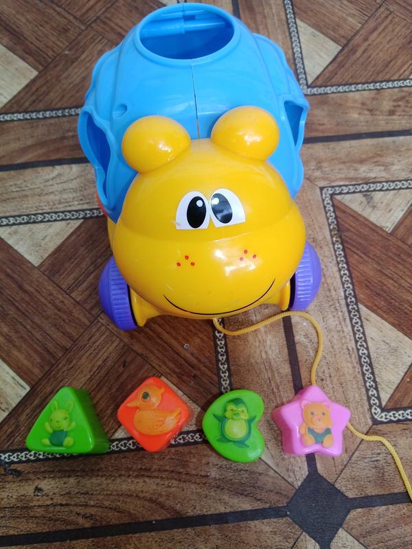 Розвиваюча іграшка Сортер-каталка. В комплекті 6 різних геометричних фігурок з тваринками. Стан гарний, все ціле.