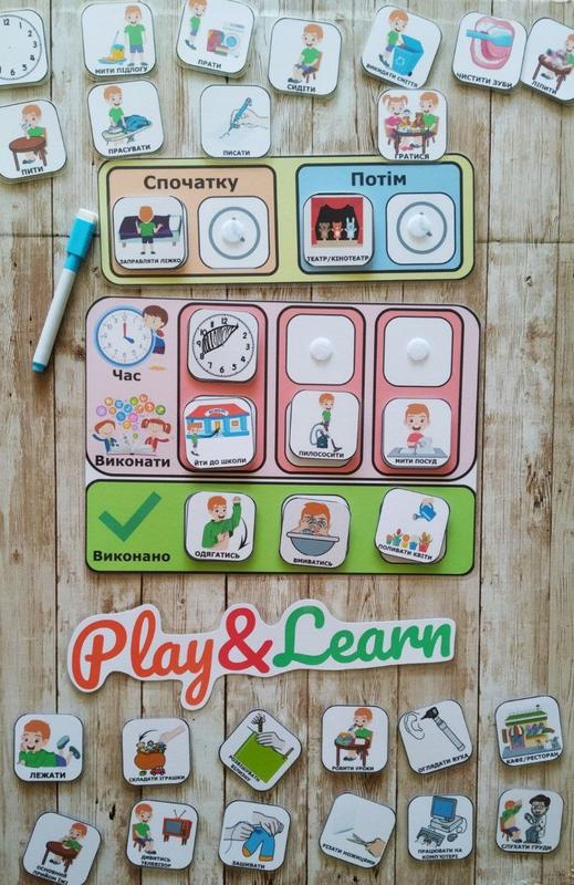Для заказа указать: для мальчика или для девочки. Набор для организации времени ребенка с карточками PECS. В набор входит: - Поле "Виконати-виконано" - Поле "Сначала-потом" - 74 карточки PESC на липучках Размер деталей на липучках (карток PECS): 5х5 см. Карточки имеют защитные поля ламинации (то есть детали водостойкие).