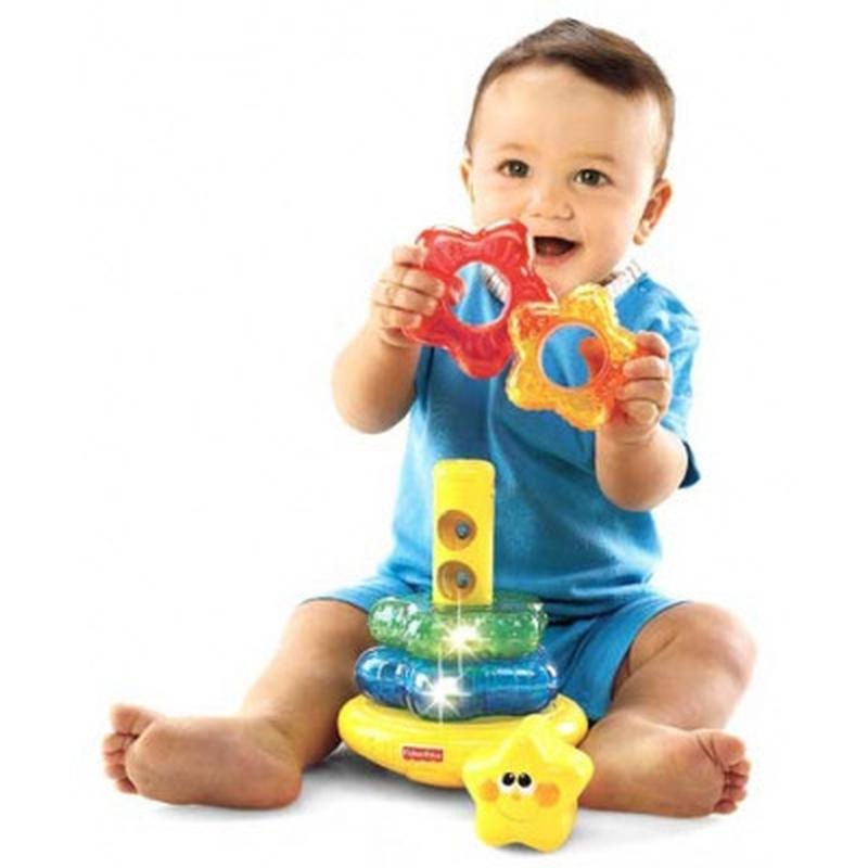 Розвиваюча іграшка Пірамідка Зірочка Fisher-Price. Пірамідка від Fisher-Price — це симпатична музична іграшка, що розвиває. Це класична пірамідка, у якої основа, чотири різнокольорові кільця у формі квіточки та верхівка у формі зірки. Пірамідка розважить малютку приємною музикою та миготливими вогниками. Суть гри полягає в надяганні кілець на основу, починаючи з найбільшого і закінчуючи найменшим. Коли голова левеня опиниться на вершині, малюк у нагороду почує пісеньку. Кільця пофарбовані в різні кольори, що покращує візуальне сприйняття дитини, а також допоможе вивчити основні кольори. Також іграшка сприяє розвитку моторики пальців рук та логічного мислення. Живлення: 3 батареї типу АА. Вік: від 6 місяців.