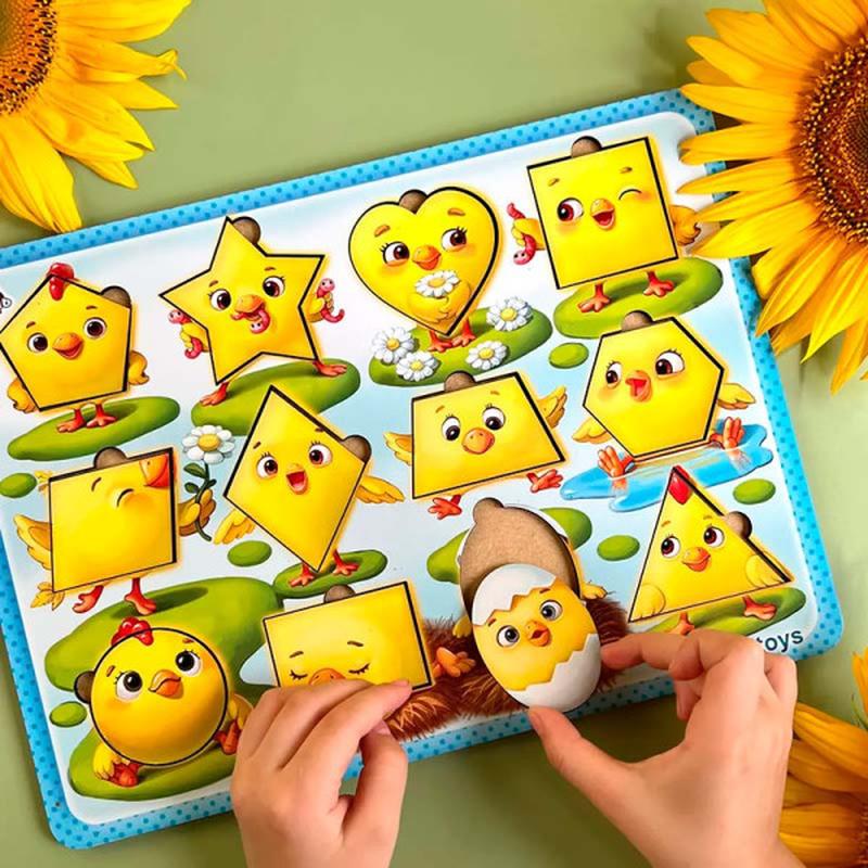 Яскрава та цікава гра. Маленькі курчата - це 12 вкладишів різної форми, які малюку необхідно вставити на свої місця. Усі деталі легко діставати пальчиками. Постійно проговорюйте назви самих фігур. Запропонуйте дитині порахувати черв’ячків або ромашки. Придумайте цікаву історію про маленьких курчат, які весело бавляться на галявині.