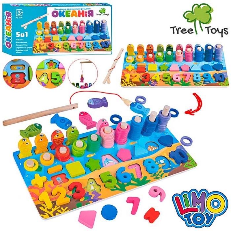 Дерев'яна іграшка навчальна Дошка MD1926 4в1, рибалка, пірамідки, сортер (цифри, фігурки), з аксесуа., в коробці 40*22*4.5см