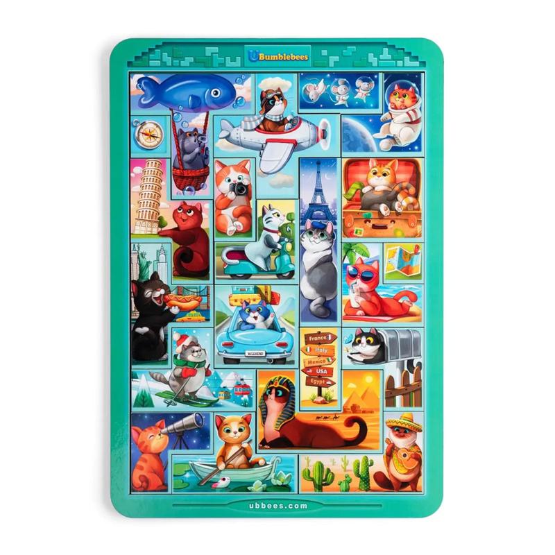 Надо разложить тематические фигурки так, чтобы все расположились на планшете по примеру (в наборе идет картинка-подсказка) и можно будет увидеть, где путешествуют эти милые котики. Учите страны мира и считайте котиков. Предложите ребенку придумать для всех героев интересные имена.