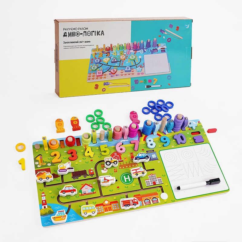 Пиши, витирай та розв’язуй цікаві завдання! Логічна дошка від "WToys" сприятиме розвитку моторики рук, логічного та креативного мислення. Вона має ігри навіть для непосидючої малечі й готова стати надійним помічником на шляху опанування цифр та літер! Разом з дерев’яними цифрами малеча складатиме свої перші приклади, стовпчики з кільцями навчать лічби, а дошка для малювання допоможе підготувати руку до письма. Цікаво, весело та неймовірно захоплююче! Особливості: - розмір дошки: 45х1х22 см; - дошка дозволяє пограти у такі ігри: магнітна риболовля, пальчиковий лабіринт, математичний сортер, кольорові кілочки та дошка для малювання; - на дошці можна побачити назви цифр англійською мовою; - до дошки додаються всі необхідні фігурки; - з дерев’яних цифр можна скласти математичні приклади; - дошка та ігрові елементи виготовлені з деревини та пофарбовані якісними барвниками, які є безпечними для здоров’я дитини. * Характеристики та комплектація товару можуть змінюватися виробником без повідомлення (47699)