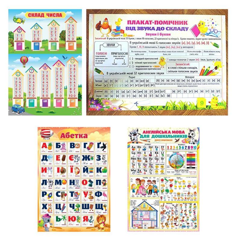 Плакат навчальний: алфавіт, англійська мова, склад числа, від звуку до складу (звуки та літери).