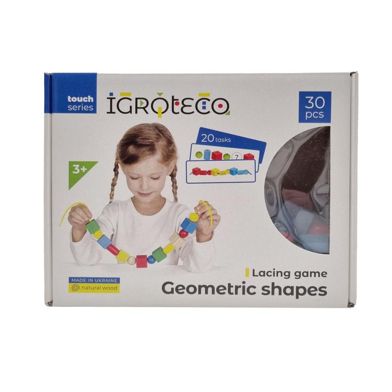 Цікаво перетворювати легковий автомобіль у вантажівку? Які шини необхідні для міських доріг, а які для лісів? Змінюй комплектацію автомобіля, переставляй фари та завантажуй багажне відділення! 30 дерев'яних фігур з отвором для нанизування та кольорові картки із завданнями - те що треба для тренування уважності та дрібної моторики рук малюка! Гра-шнурівка - це відмінна іграшка маленьких пальчиків: нанизування елементів на кольорові шнурівочки чудово тренує дрібну моторику рук, пришнуровування деталей до дерев'яної основи вдосконалює координацію рухів, а велика кількість можливих комбінацій елементів та їхнє розташування на основі розвиває уяву, образне мислення. Гра заохочує дитину отримати результат, спонукає концентрувати увагу, зосереджуватися, виховує посидючість. До набору "Геометрика" входять: 30 дерев'яних кольорових елементів -10 кубиків (25x25 мм), 10 кульок (діам. 20 мм), 10 циліндриків (діам 20 мм, довж. 30 мм) 2 шнурівки (довж. 40 см) 10 кольорових двосторонніх карток із цікавими завданнями різної складності (40 завдань) Як грати? Обирай картку зі схемою та нанизуй фігури у тому ж порядку або розгадуй логічні завдання - знаходь фігуру що заховалася, сортуй за спільною ознакою чи будуй вежу. Для дітей від 3+ Матеріал: натуральне дерево, сертифіковані фарби на водній основі, текстильні шнурівки.
