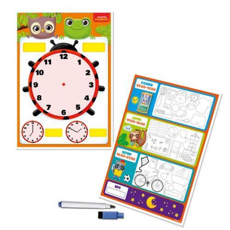 Розвиваюча дошка-тренажер для найменших. На одному боці зображений годинник, на якому дитина зможе малювати стрілочки маркером, що стирається, а на другій - розпорядок дня і пунктирні зображення різних занять, відповідних часу доби. Дитина зможе обводити лінії маркером та вивчати назви різних предметів. Розмір дошки: 24х34 см. Бренд: Vladi Toys Упаковка: Плівка Колір: Різнокольоровий Вага з упаковкою: 205 г Габарити в упаковці: 1 x 24 x 34 см Габарити без упаковки: 1 x 24 x 34 см Країна виробник: Україна Матеріал: Комбінований Комплектація: Дошка, маркер