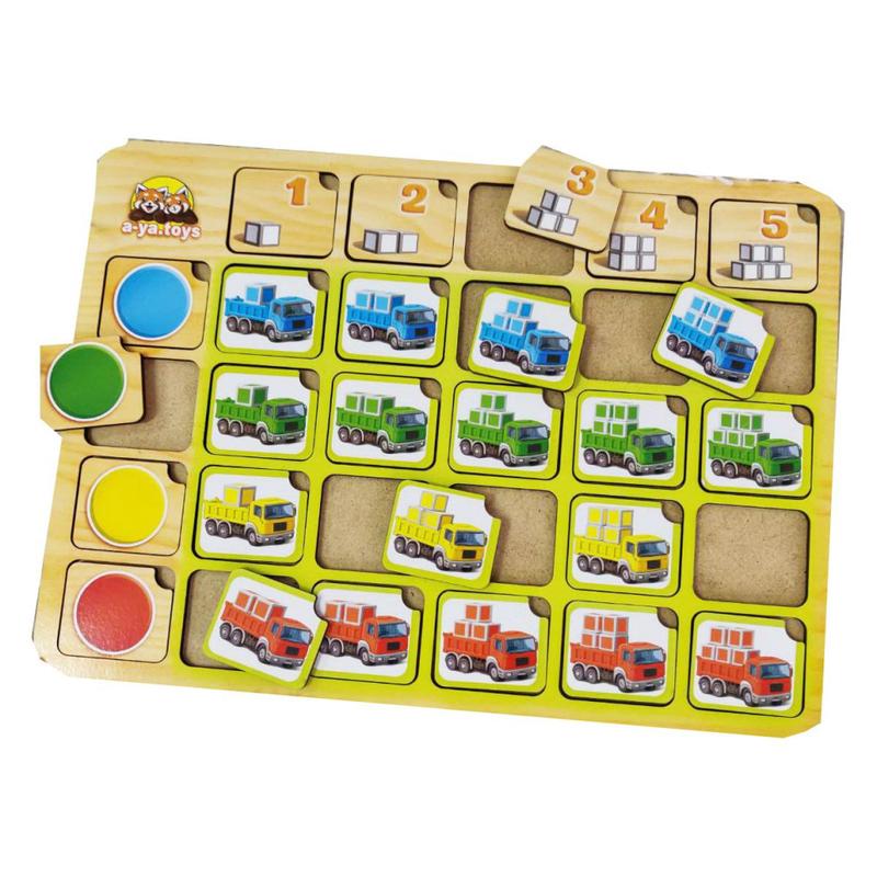 У наборі 29 плашок для сортування. Зліва знаходяться 4 плашки, які відповідають за колір вантажівки, а зверху - 5 плашок з різною кількістю кубиків для вивчення рахунку від 1 до 5. Як грати: дитині необхідно розташувати плашку з вантажівкою у потрібній графі, у зазначеному кольорі та з необхідною кількістю кубиків у кузові. Усі деталі взаємозамінні - це означає, що кожного разу можна змінювати умови гри. Гра розвиває увагу, логіку, мислення та пам'ять. 1. Розвиток логічного і понятійного мислення 2. За допомогою такого методичного матеріалу, діти пізнають навколишній світ. 3. Розвивається дрібна моторика. Вставляючи певним чином детальки, чудово тренуються пальчики. 4. Працює зорова пам'ять, тренується увагу і посидючість.