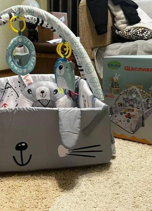 Большой развивающий интерактивный коврик для младенцев детей. В идеальном состоянии. Из недостатков только одна игрушка чуточку потепана, дополнительные фотодам. Преимущества: - 7 многофункциональных, оригинальных игрушек, - возможность раскладывания коврика в 3-х комбинациях, - мягкое, скользящее, идеально изолирующее дно; - подушка на животику, - легко моющийся и очень приятный на ощупь материал, - оригинальные цвета, стимулирующие развитие ребенка; - Поднятие сторон; - застежки-липучки, - съемные и регулируемые игрушки и дуги, - подушка для живота в комплекте. Характеристики: - Размер: 100х110х53 см - Цвет: серый кролик Комплектация: - килимок, - 4 стенки, - 2 дуги, - 5 многофункциональных игрушек, - подушка.