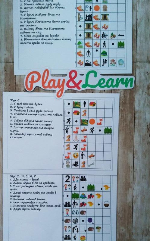 Логопедичний набір "Прочитай" зображення: • Дитина розповідає історію, дивлячись на картинки справа. • Зліва написана підказка (для дорослого). • Мова: українська У набір входить 6 двосторонніх листів