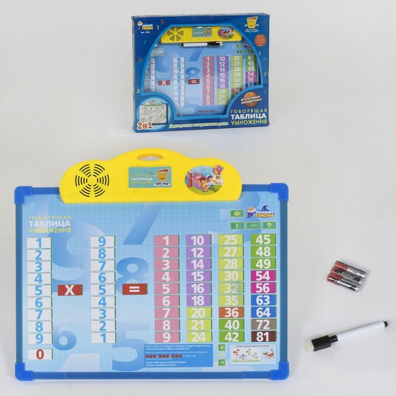 Двусторонняя интерактивная доска таблица умножения поможет вашему ребенку получить математические знания в игровой форме. На одной стороне находится плакат с таблицей умножения, который имеет звуковое сопровождение, на другой – доска, которая позволяет закрепить пройденный материал. В комплекте с интерактивной доской идет маркер и терка. Подходит для самостоятельного обучения Располагается на столе или на стене Влагостойкая поверхность Регулятор громкости Сенсорные кнопки Автоотключение Управление: 1. Кнопка включения/выключения; 2. Кнопка-информация о том, как пользоваться таблице; 3. Веселая песенка; 4. Кнопка «Испит» - внимательно слушай вопрос и нажимай на кнопку с правильным ответом. 5. Регулировка громкости. На обратной стороне доски можно рисовать маркером, благодаря чему можно самостоятельно составлять по рисунку задачи на умножение. Озвучка на русском языке. Работает от 3-х батареек типа «ААА» 1.5V (в комплекте). Упаковка: коробка