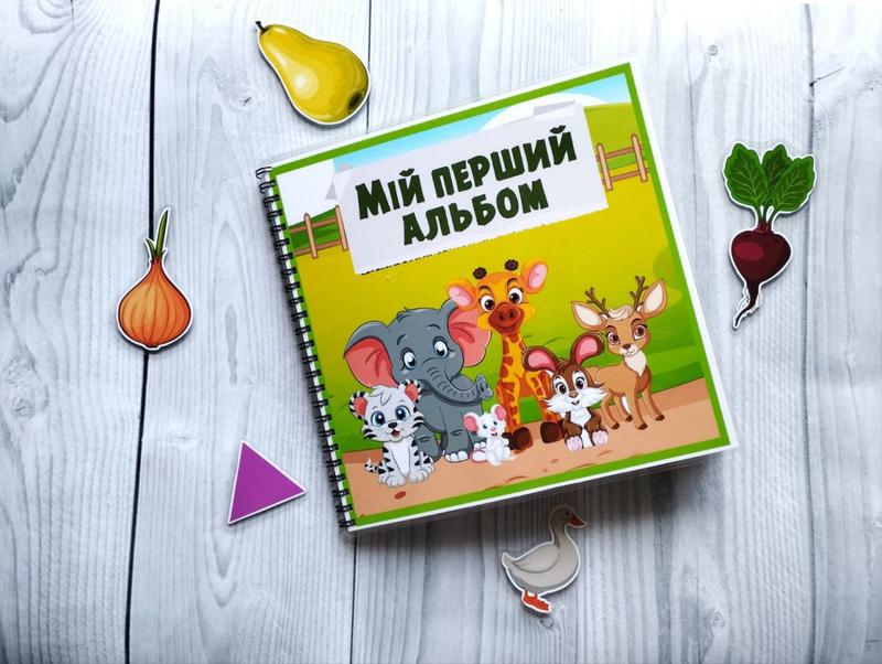 Альбом на липучках "Мій перший альбом" Вітаємо у світі веселих відкриттів! Цей альбом містить 4 розвороти: - Овочі - Фрукти - Свійські тварини - Дикі тварини - Кольори та геометричні фігури У комплекті 42 деталі на липучках, які допоможуть дітям вивчати світ навколо них, граючи та навчаючись! Особливості: Липучки: Досить просто прикріпити та зняти деталі, що дозволяє дітям змінювати композиції та створювати власні сюжети. Це сприяє розвитку дрібної моторики та креативності. Безпечний матеріал: Всі деталі виготовлені з безпечних, якісних матеріалів, що гарантує безпеку під час гри. Розмір альбому: 21х21 см – ідеальний для маленьких ручок!
