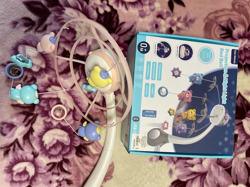 Мобіль рожевого кольору Багато мелодій, звуків і режимів, регулюється звук, зверху в куполі підсвітка різних кольорів( можна і вимкнути) і в низу є світло, яке також вимивається, крутиться по колу і може стояти на місці Все регулюється і прауює в різних режимах
