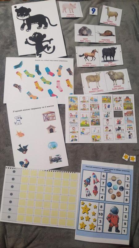 Матеріали можна використовувати для вивчення нового, виконання завдань, вирізання, навчання читанню, підготовка до школи - все залежить від Вашої фантазії🙌. Перелік (представлено на фото): - Завдання/деталі/ігри: гра "хто що їсть та де чия мама" читання, велике/маленьке, цифри, фігури, пори року, тварини, лабіринти, холодне/гаряче, більше/менше, алфавіт, професії, багато/мало, транспорт, фрукти, продукти, планер, кольори, - Картки/плакати: винаходи, читання, транспорт, ягоди, для новонароджених, фрукти, рахунок, кольори, літери, тварини, Зошит: із завданнями "Коти та собаки" російською. Матеріали: папір, картон та ламіновані. Брак: друку (недодруковано на папері, картоні, зайві картки/деталі); ламінації (пошкодження ламінації).