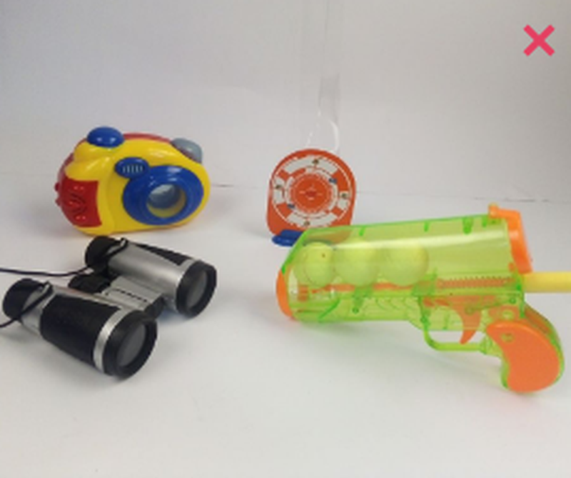 Помповий пістолет, дитячий фотоапарат та дитячий бінокль.
