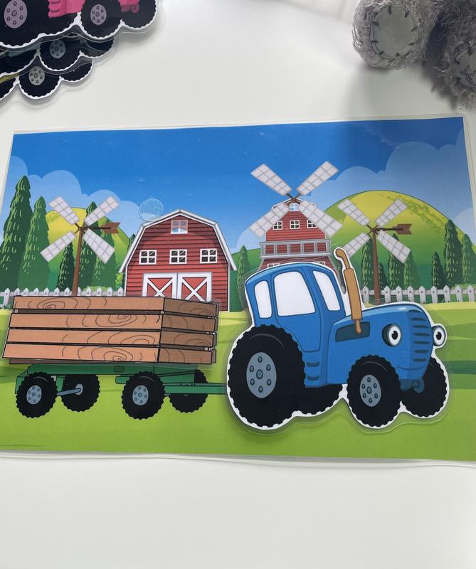 Односторінкова гра «Синій трактор» ✅ 11 різнокольорових тракторів – вчимо кольори та розвиваємо моторику ✅ 11 тваринок – знайомимося з мешканцями ферми ✅ 11 хмаринок зі звуками – вчимося розпізнавати та наслідувати звуки