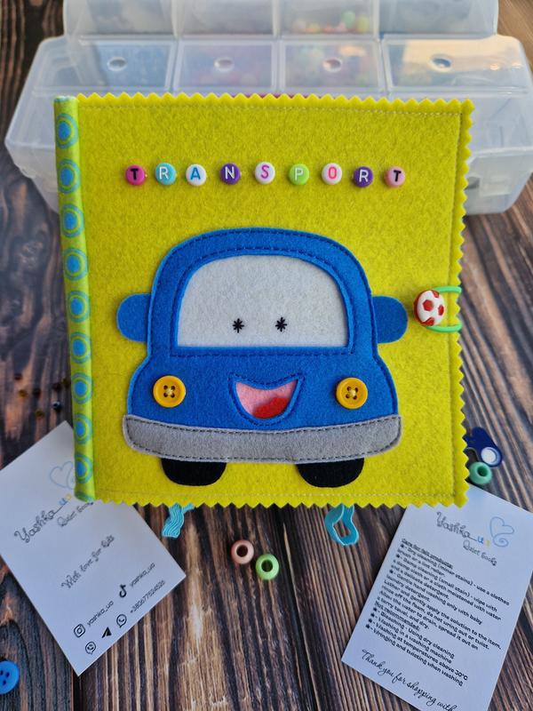 Опис сторінок: 1. Титульна сторінка з веселою машинкою і написом «Транспорт» англійською. 2. Корабель. Перетягуємо якір, вивчаємо кольори, рахуємо до трьох ілюмінатори. Вдалині маяк показує шлях судну. 3. Шкільний автобус. Колеса на липучках. Вивчаємо рахунок до трьох та звірів у віконцях бусика. Червоний метелик хоче сісти на автобус. 4. Підводний човен. Пропелер крутиться, шукаємо мушлю під водоростями, торкаємось камінців, яскрава рибка пливе поруч. 5. Автомобіль. Відриваємо віконечка і шукаємо там звірят. Вивчаємо кольори світлофора. 6. Трактор. Велике колесо знімається і одягається на ґудзик. Смішне кошеня у віконці. 7. Тепловоз потяга. Велике колесо на магнітній кнопці. Можна потягнути за пар на гумці. Весела жирафа за кермом. 8. Вантажівка з маленьким кошеням за кермом везе фрукти. Яблучко складаємо в кузов. 9. Гелікоптер. Пальчиком пересуваємо ґудзички у вікні. Пропелер на кнопці крутиться по колу. 10. Екскаватор. Ківш рухається і знімається за допомогою кнопки. Котик керує транспортом, а пташечка спостерігає за роботою з ялинки. 11. Літачок. Пропелер з великим ґудзиком і шнуром. Сонечко з безпечним дзеркальцем ( треба зняти захисну плівку). 12. Остання сторінка з логотипом. Це готова робота. Але можна виготовити під замовлення з ім’ям малюка. Ціна однієї ігрової сторінки 200 грн. Ціна титульної сторінки з ім′ям малюка 250 грн. Виготовляю мінімум 4 ігрові сторінки. Строк виготовлення книжечки від 10 днів.