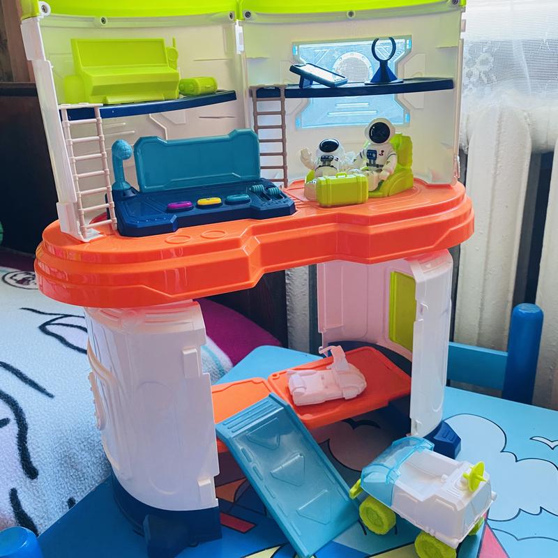 Детская космическая станция. Наклейки цели, можно наклеить, пульт управления на батарейках, есть звуковые эффекты. Можно на подарок, оригинальный коробок есть, в нем могу отправить. Стан нового. Имеется один дефект на одной ступеньке, но не внушительно.