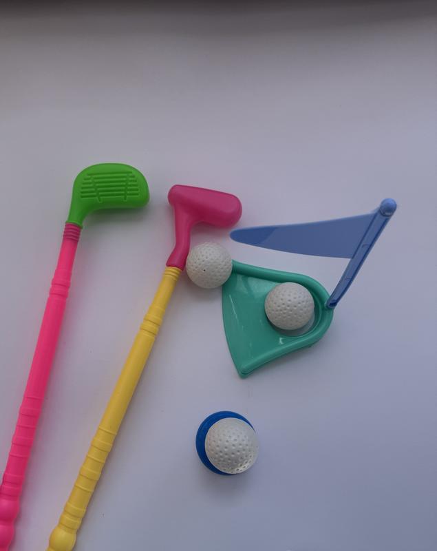 Дитяча гра в гольф Комплект складається з: • Двох пластикових клюшок (жовта з рожевим і рожева з зеленою головкою). • Трьох м’ячиків для гольфу. • Лунки у вигляді пластикового майданчика із прапорцем. • Одного пластикового тримача для м’яча (схожого на підставку або тішку). Гра полягає в тому, щоб за допомогою клюшки влучити м’ячем у лунку. Це відмінна гра для розвитку координації рухів та моторики у дітей, а також просто весела активність на свіжому повітрі чи в приміщенні.