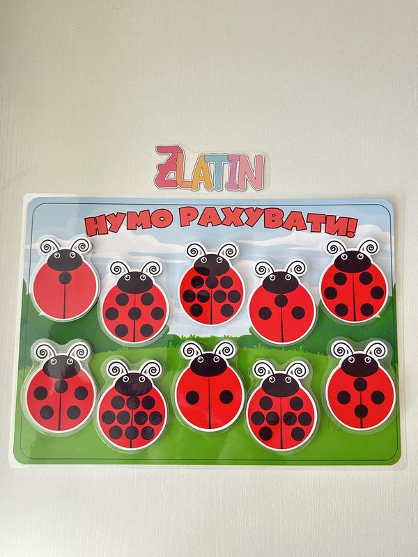 Цікава математична гра «Нумо рахувати» зацікавить малюка, оскільки вона яскрава та повчальна. Основа:А4 та 10 жучків сонечко Кількість крапочок на спинці жучка відповідають цифрі на основі. Цифри розташовані в хаотичній послідовності