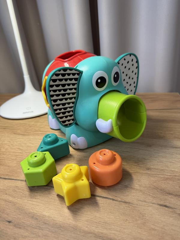 Сортер Infantino Слон Джамбо створений для веселого вивчення кольорів і форм. Завдання для малюка — правильно підібрати фігурки за кольором і формою. У комплекті іграшки 5 фігурок, які дуже легко схопити руками. Отвори в слоні обведені кольором для підказки у виборі форми. Для початку гри малюк повинен натиснути на вухо слоника, щоб всі фігурки випали з хобота. Якщо прокрутити хвіст слоненяти, отримуємо нову форму зверху. Завдяки великим отворам малюк зможе розглядати фігурки всередині і розмістити їх в слоні для зберігання.