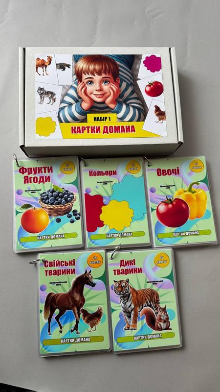 Набір карток Домана на кільці Ідеально для раннього розвитку дитини! 👶 У наборі -- 5 тематичних блоків по 15 карток кожен (усього 75 карток): • 🐄 Свійські тварини • 🍅 Овочі • 🎨 Кольори • 🍓 Фрукти та ягоди • 🐻 Дикі тварини 🖼 Картки яскраві, міцні, зручного формату, скріплені на кільце -- зручно брати з собою й не загубити! 💬 Ідеально для поповнення словникового запасу, навчання перших слів, гри та розвитку пам'яті. Повний набір із 5 тем -- 900 грн