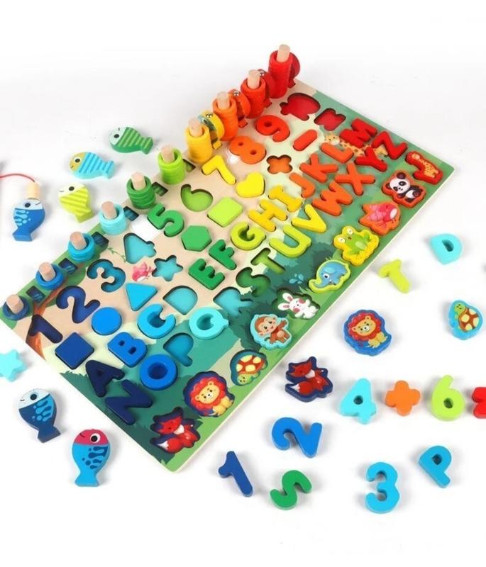 Супер поучительная досточка Всезнайко из дерева 5в1 для деток! Набор, в котором есть все необходимое для изучения цвета, цифры, фигуры, учиться счету, сортировать фигурки по цветам, а также изучить буквы русского алфавита Набор очень яркий, состоит из деревянного основания с ячейками сортера, а также колышками с пластиковыми разноцветными колечками, также в комплекте идет магнитная рыбалка. Всего в наборе шесть рядов: первый ряд – это колышки с колечками и магнитная рыбалка с разноцветными рыбками; второй ряд ряд – это ячейки под цифры от 1 до 10; третий, четвертый и пятой ряд – это ячейки для букв русского алфавита; шестой ряд – это ячейки для фигурок животных. С таким набором занятия будут проходить интересно и полезно, ребенку не станет скучно с этой игрушкой. Объемными фигурками приятно играть. А во время игры набор поможет развить логику, моторику рук, мышление, память, ловкость и внимание. Ежедневные разнообразные занятия с малышом благотворно влияют не только на его развитие, но и на эмоциональное состояние ребенка.