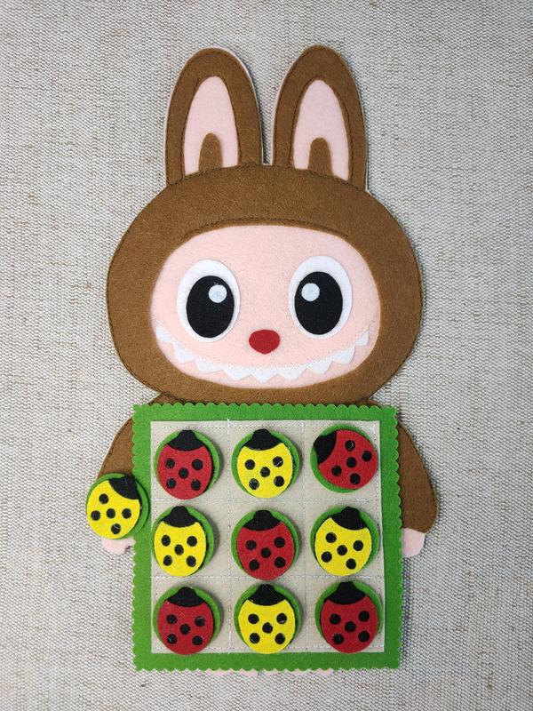 Развивающая игра "Крестики-нолики" в новому формате. Популярная сейчас игрушка Лабубу добавит азарта и настроения играющим малышам. Размер Лабубу 30 см, размер игрового поля 12*12 см. Пошита из фетра, все мелкие детали крепятся к игровому полю липучками. Не требует особых условий хранения, можно стирать.