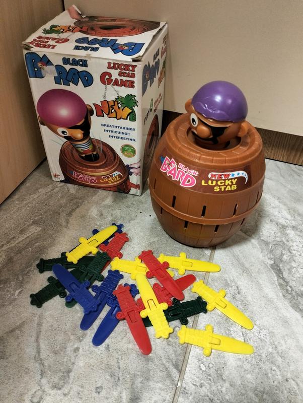 Настільна Гра Пірат у Бочці. Весела колективна гра для дітей від 4 років, де можуть взяти участь 2 або 4 людини. Гра розвиває спритність, увагу та координацію рухів. Справжня бочка веселощів! Гра не тільки потішить і розвеселить Вас, а й допоможе провести незабутній вечір у колі сім'ї. Гра Пірат у бочці або Хитрий пірат призначена для двох - чотирьох піратів від чотирьох років бойового стажу, які ризикнули випробувати удачу разом із Джо. Учасники розбирають кинджали обраного ними кольору, заздалегідь переконавшись, що спритний пірат уже сів у бочку. Потім гравці по черзі встромляють свій кинджал у бочку з Джо. Щоразу, коли пірат вистрибне на свіже повітря, гравець, який спровокував його, вибуває з боротьби. Переможцем вийде останній щасливчик, що залишився в грі. Пірат у бочці - це весела забава, що ґрунтується винятково на удачі, адже щоразу «шкідливий» для пірата отвір розташовується по-новому, змушуючи маленьких піратів, які беруть участь у грі, весело здригатися від несподіванки, коли пірат Джо нарешті підстрибує зі своєї бочки! Необов'язково любити море, щоб стати піратом! Достатньо просто зіграти в цю веселу забаву хоча б один раз, щоб перейнятися її відважним духом змагальності. І хоча гра, найімовірніше, сподобається насамперед хлопчикам, юні леді теж із задоволенням візьмуть участь у витягуванні пірата Джо з бочки. Гра містить великі, яскраві деталі, досить міцні, щоб витримати не один натиск піратських атак!