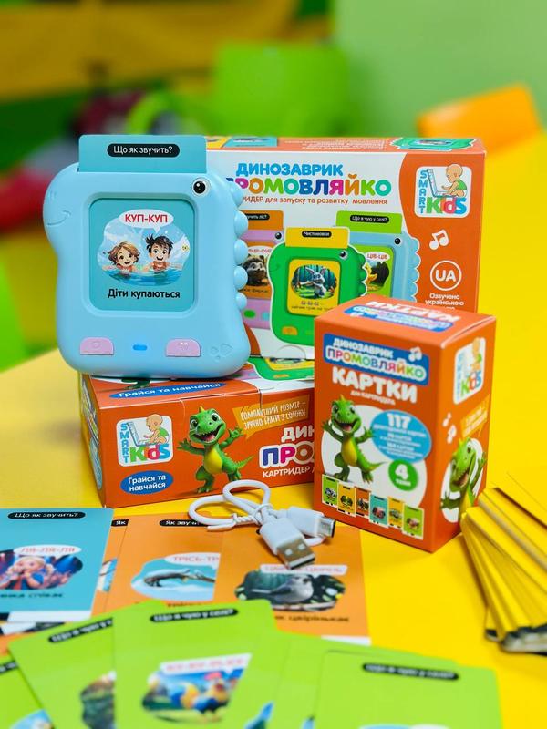 Ця навчальна гра, яка перетворює процес навчання на захопливе заняття😍 Інтерактивний кардридер у формі динозаврика 🦖озвучує слова українською мовою,💙💛 щойно дитина вставляє картку в слот. 🧸 Іграшка допомагає дітям вивчати нові слова та розвивати мовлення в ігровій формі. Підходить для дітей дошкільного віку. Особливості: ❣️Динозаврик-картридер; ❣️акумулятор; ❣️звук українська мова 💙💛; ❣️117 двох сторонніх карток ; ❣️4теми (чистомовки, Що як звучить?, Як звучить ліс? Що я відчуваю в селі) Працює від акумулятора , USB в комплекті