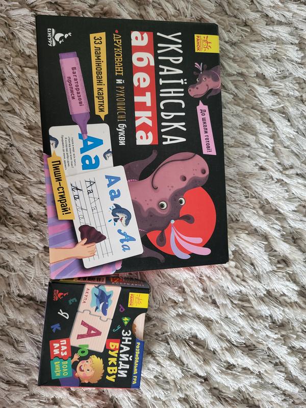 ламіновані багаторазові картки для вивчення написання літер, а також пазли для розпізнавання літер та слів, які починаються на них починаються