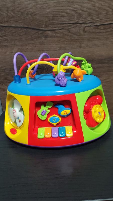 Развивающий игровой центр Kiddieland Мультицентр. Это многофункциональная музыкальная и развивающая игрушка, предназначенная для детей от 1 года. Он стимулирует развитие мелкой моторики, логического мышления, знакомит с формами и цветами. Имеет различные игровые зоны, включая пианино, музыкальные инструменты, компьютер для изучения форм, часы в виде совы и лабиринт с бусинами. Мультицентр озвученный на украинском языке и содержит детские песенки и стихи. Питание осуществляется от батареек.