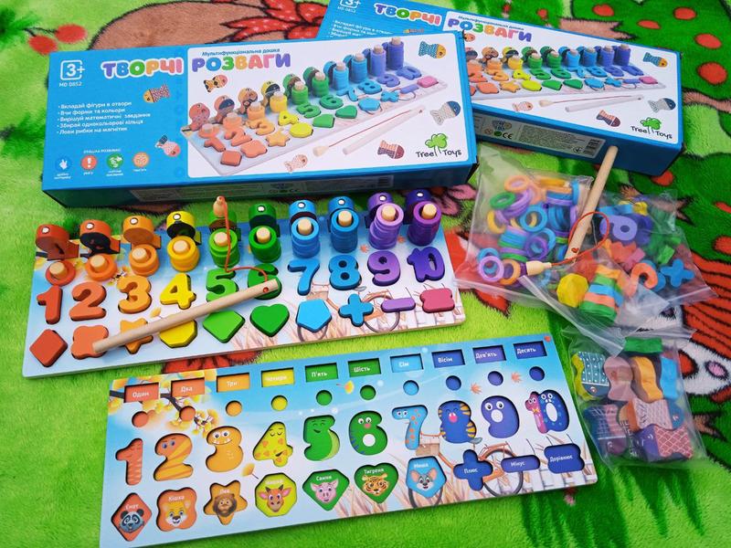Розвиваюча дерев'яна дошка сортер Прямокутна дерев'яна платформа має такі ігри, як: • математичний сортер; • магнітна рибалка; • сортер із різним видом геометричних фігур; • порахуй кілечки.