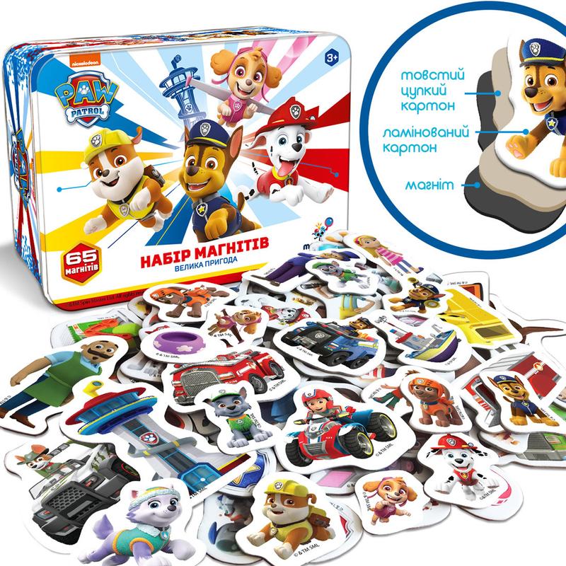 Набір магнітів Щенячий патруль — світ пригод та веселощів в одній коробці! З улюбленими цуценятами тепер можна грати будь-коли. Як грати? Кріпити на будь-яку металеву поверхню магніти героїв та предмети. Вигадувати свої історії та ігри. Рахувати й описувати магніти. З магнітами зручно грати, оскільки вони досить великі та зручні для дитячої руки, міцні, товсті та мають закруглені краї. Дитина розважається й одночасно тренує пам'ять, увагу, мислення та дрібну моторику
