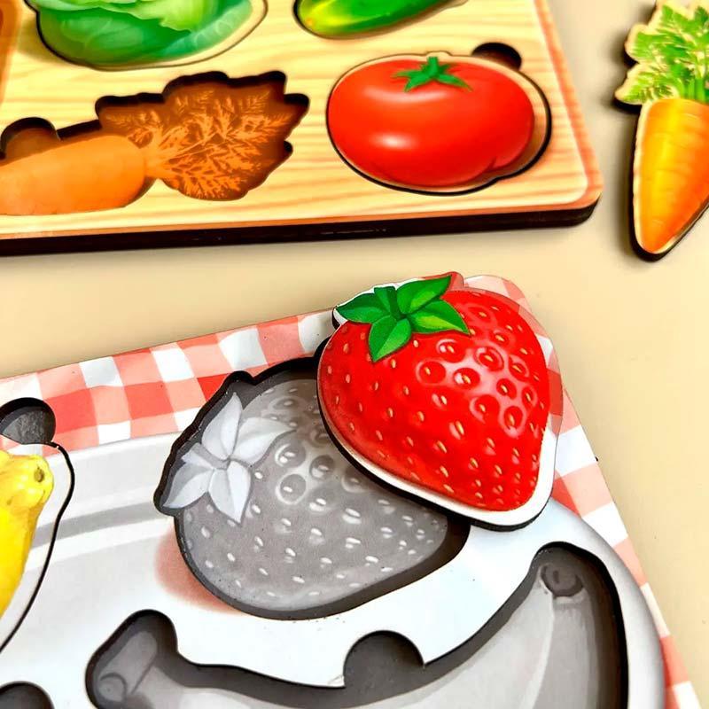 Міні-вкладиші з підказкою-силуетом кожного фрукта на дні. Рамки-вкладиші розвивають дрібну моторику пальчиків (яка безпосередньо пов'язана з розвитком мови), координацію рухів, сенсорику, тактильні відчуття, допомагають навчити початковому рахунку (від 1 до 4), вмінню порівнювати розміри (маленький- великий, більше-менше).