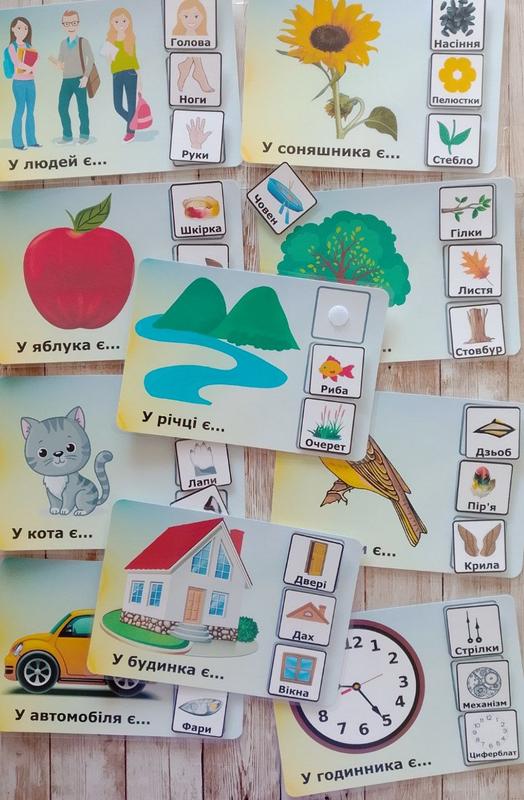 Гра “У кого що є?” — цікаве знайомство зі світом навколо! Малюк дізнається, з яких частин складаються знайомі об’єкти — дерево, будинок, автомобіль, люди, кіт та інші. Дитина прикріплює деталі на липучках до відповідного поля, тренуючи логіку, увагу й мовлення. ✨ У наборі: • 10 ігрових полів (формат А5) • 30 яскравих деталей на липучках Гра підходить для дітей від 3 років. Допомагає вивчати нові слова, узагальнювати предмети та розвиває дрібну моторику. 🌿 Можна використовувати вдома, у садочку чи в логопедичних заняттях. Весело, пізнавально і багаторазово!