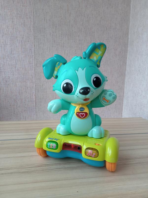 Розвиваюча іграшка VTech Hover Pup Цуценя Дізнайтеся про цифри та підрахунок за допомогою гри на підлозі, а потім вставайте та танцюйте з цим обнадійливим цуценятом, який обертається і котиться на його ховерборді. Датчики руху дозволяють цуценяті уникати перешкод і продовжувати рухатися вперед, коли хтось слідкує за ним. Нажміть дві кнопки навчання, серце та інтерактивну кнопку лапи, щоб дізнатися про цифри, підрахунок, музику та почуття та почути заохочувальні фрази. Більше 65 пісень, мелодії, звуків та фраз допоможуть дітям вивчати слова разом із жвавими мелодіями. Призначений для дітей 9–36 місяців. Мова англійська Висота 26 см Стан дуже хороший, є незначні потертості не носику Ціна: 700 грн