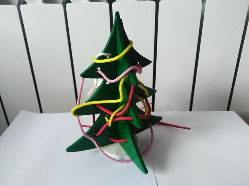 Висота ялинки - 18см. Матеріал - дерево. Шнурки - три різні кольори Упаковка - кульок Ялинка продається у розібраному вигляді.