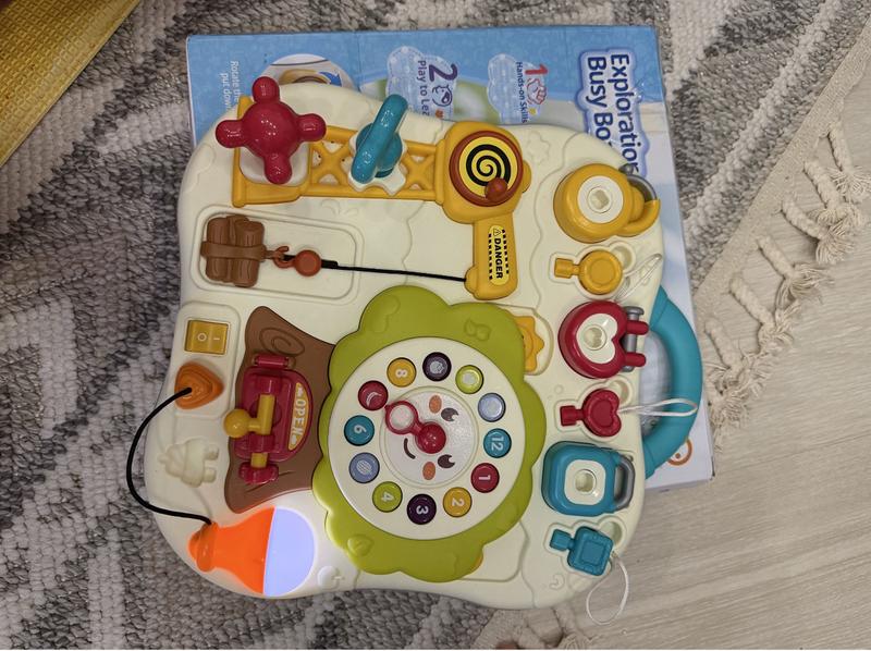 Поєднує в собі 10+ інтерактивних елементів, які в ігровій формі розвивають дрібну моторику, логіку, сенсорне сприйняття та навчають базових навичок. Розмір 34,5-34-6,5 см Вік від 1 року Є коробка Стан гарний, все працює, лампочка горить, музика грає.